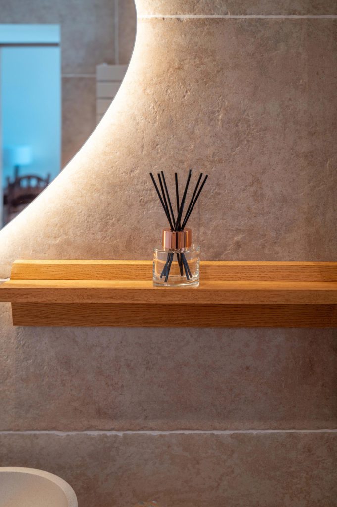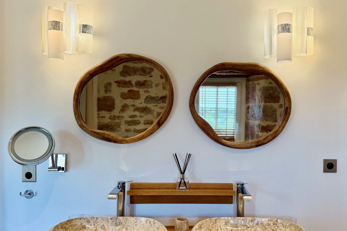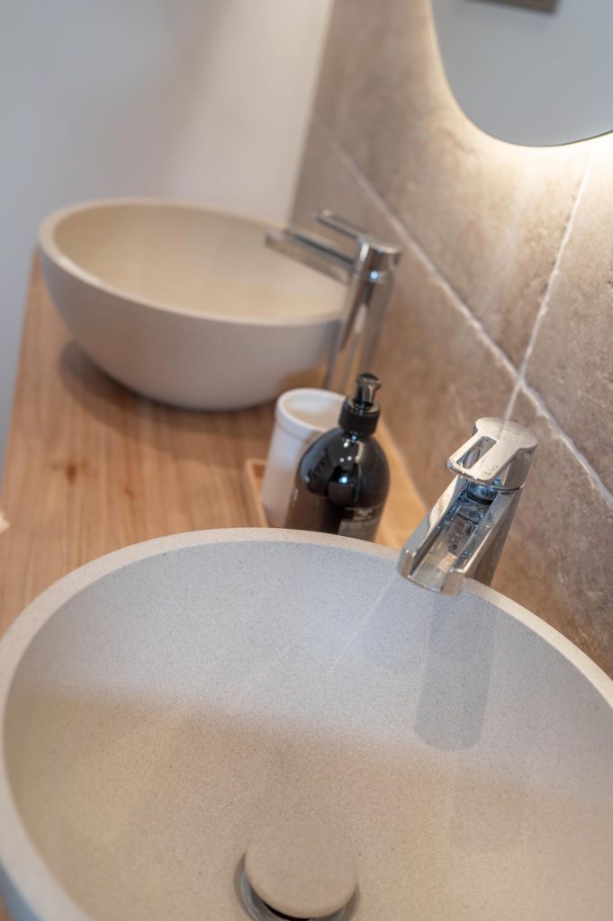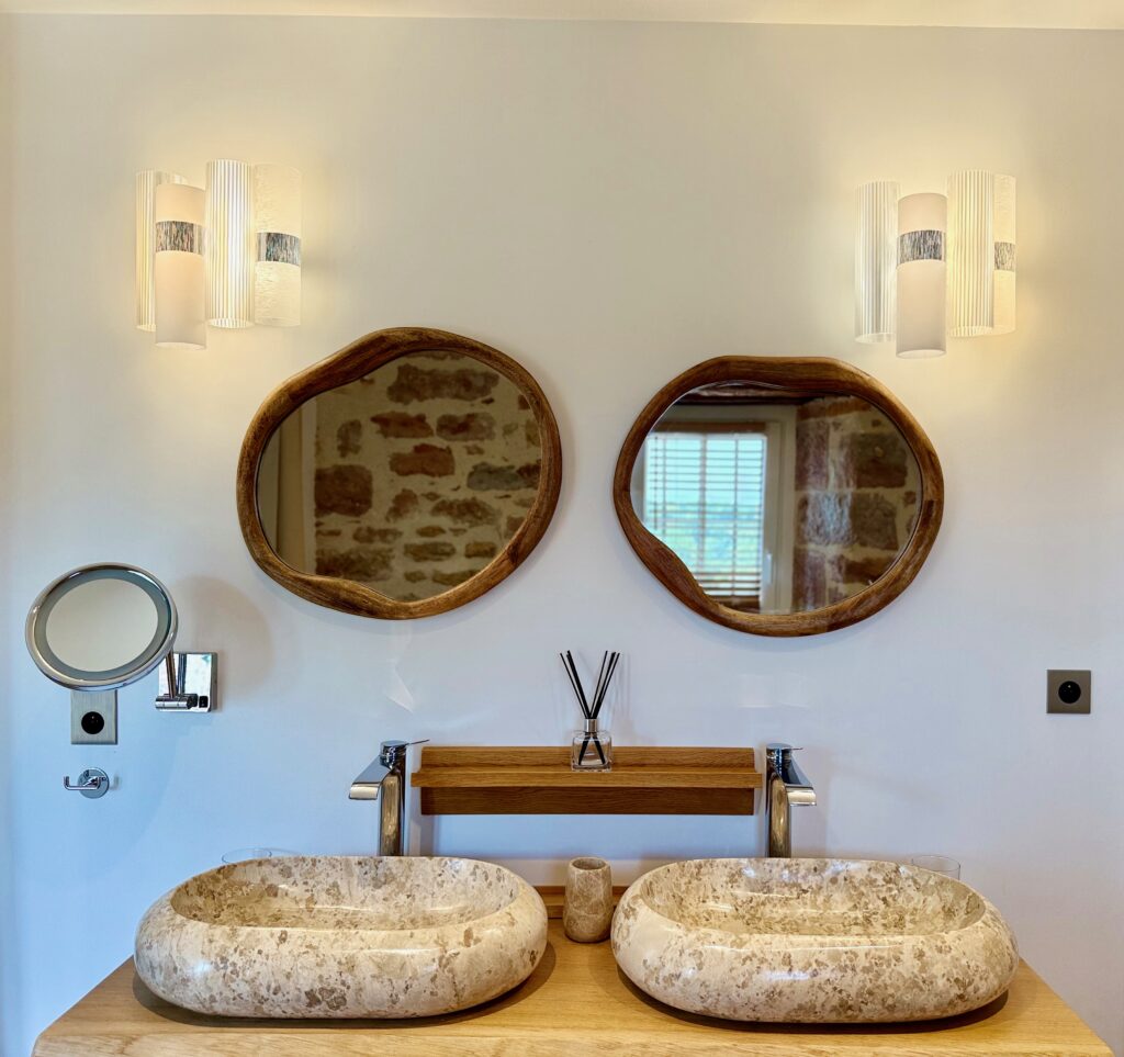 Salle de Bain de Standing : la grande salle de bain est pensée dans une démarche d’éco-responsabilité, faisant écho à la production locale avec l’utilisation de travertin. Elle est équipée d’une douche spacieuse et moderne.