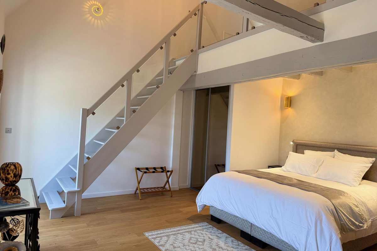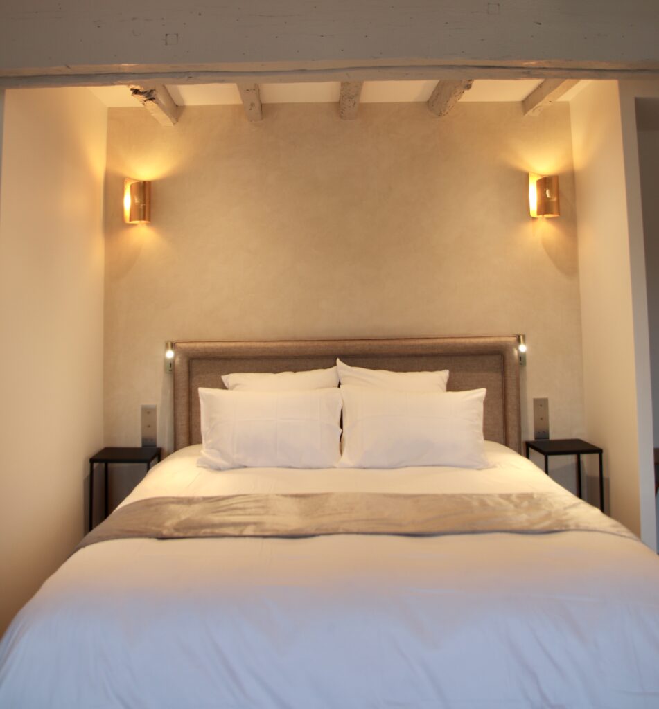 Au-dessus de vous, les poutres d’origine racontent l’histoire du lieu, enveloppant la pièce d’une chaleur intemporelle, autour d’un grand lit douillet.
