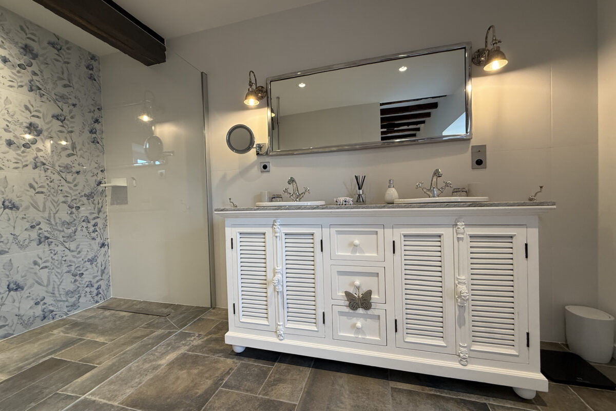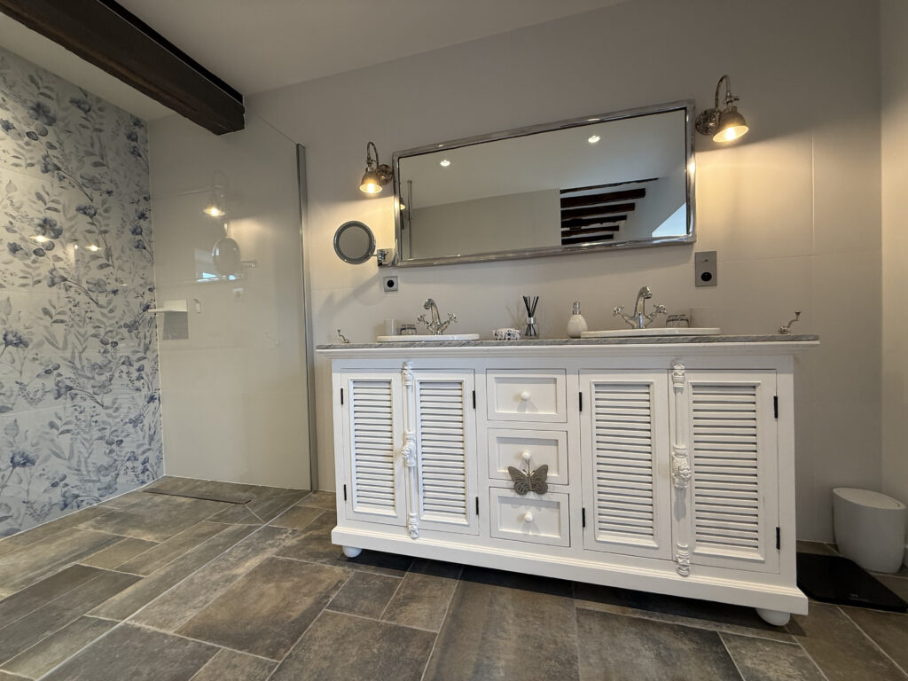 - Une salle d’eau moderne avec des portes de douche représentant la silhouette du château, invitant à un pur moment de détente.
