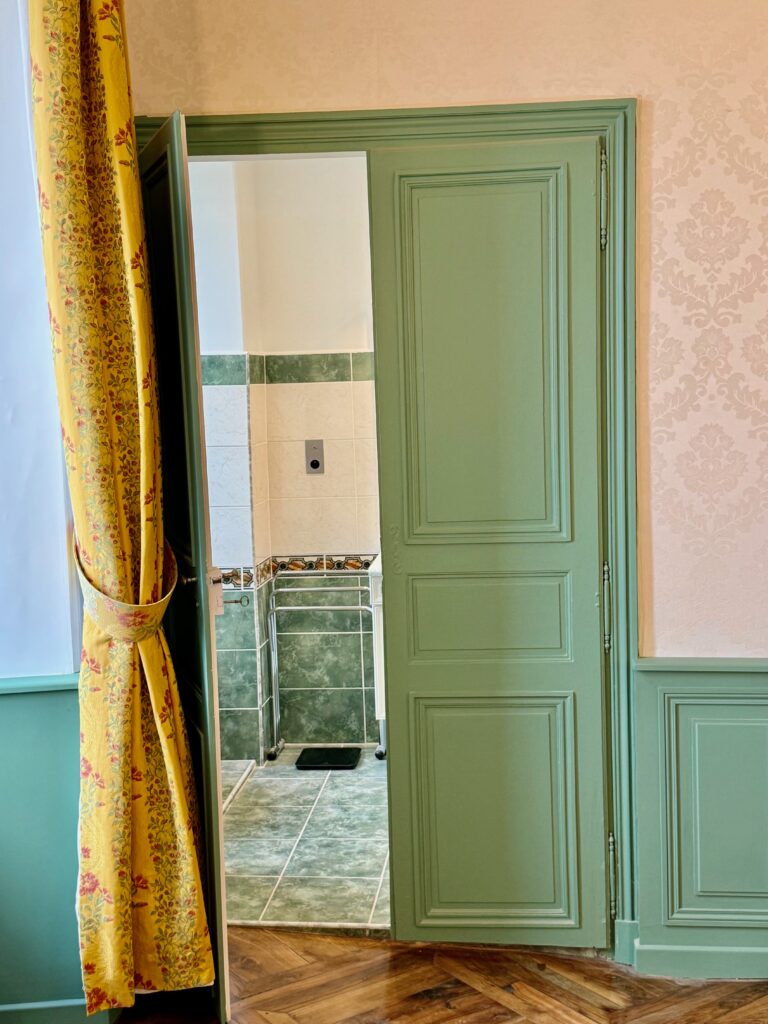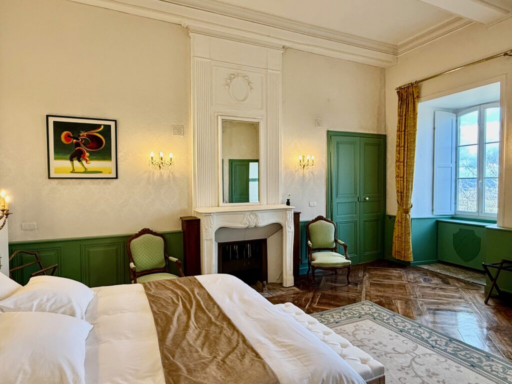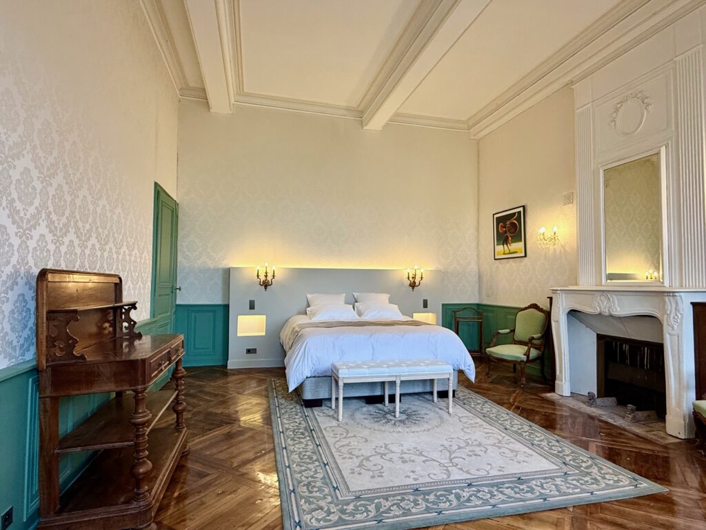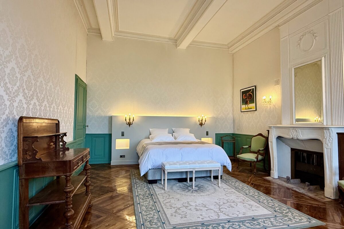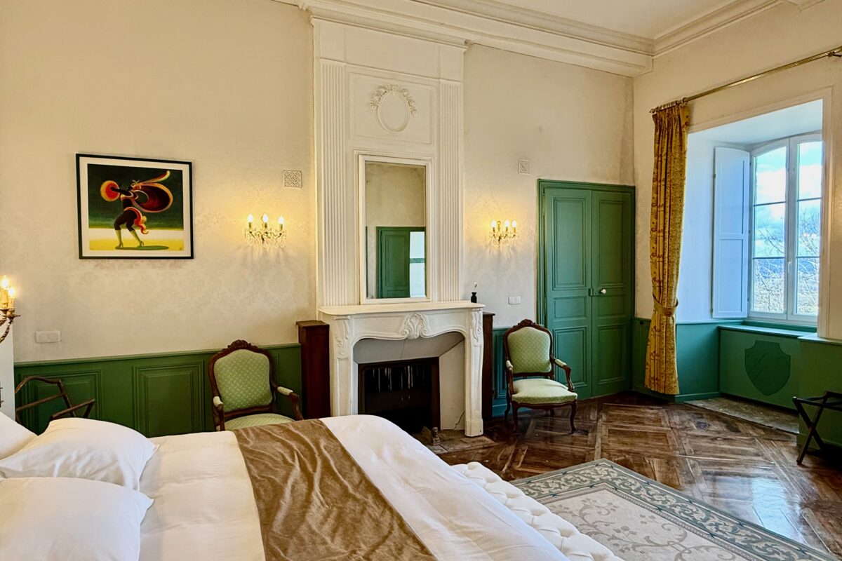 Cette belle chambre de 47m2 est située au premier niveau de la tour poivrière. Le mobilier, la tapisserie murale et les rideaux installés au siècle dernier ont été rénovés, mais conservés afin de préserver l’esprit « château ».