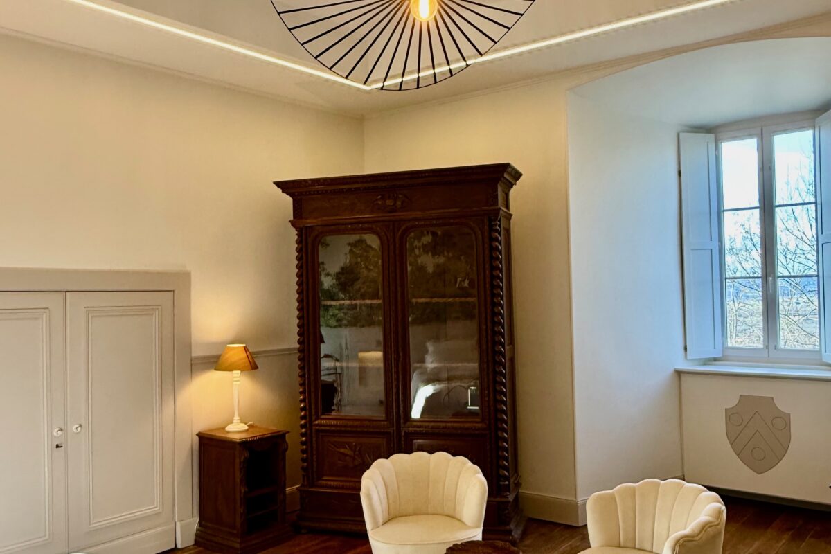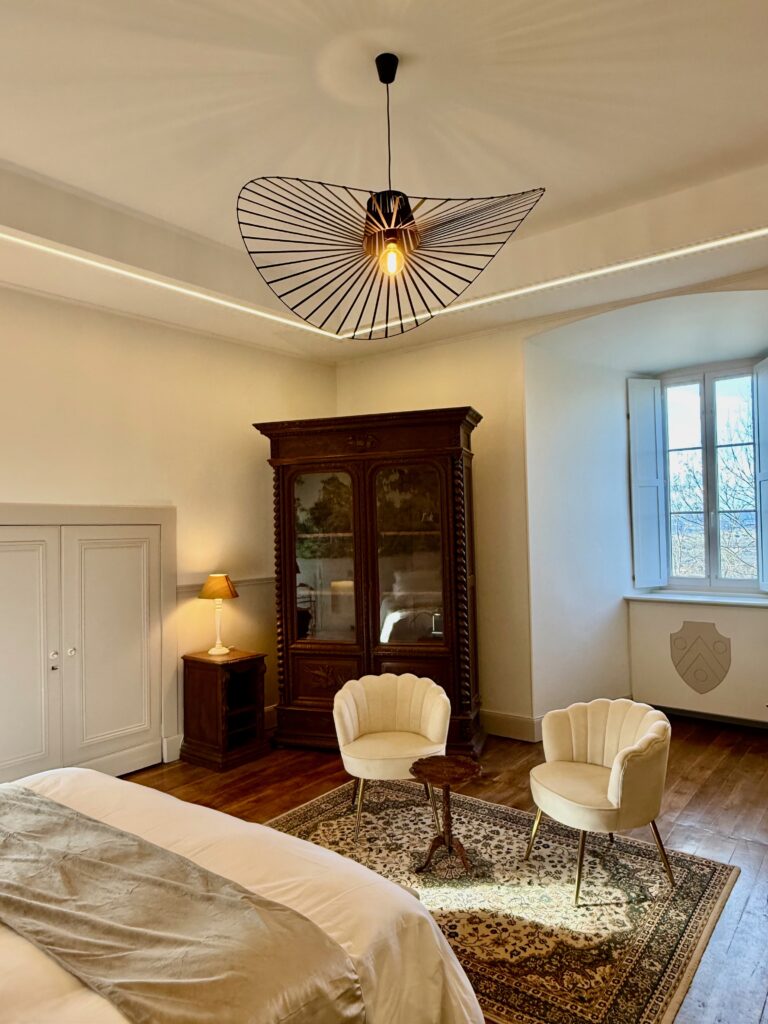 Vous apprécierez son large volume, sa salle de bain spacieuse et lumineuse, équipée d’une grande douche à l’italienne, et son balconnet en surplomb de la terrasse du château.