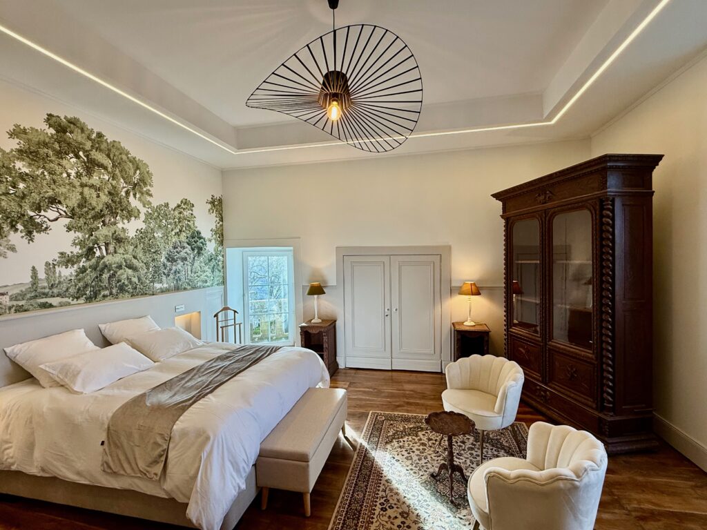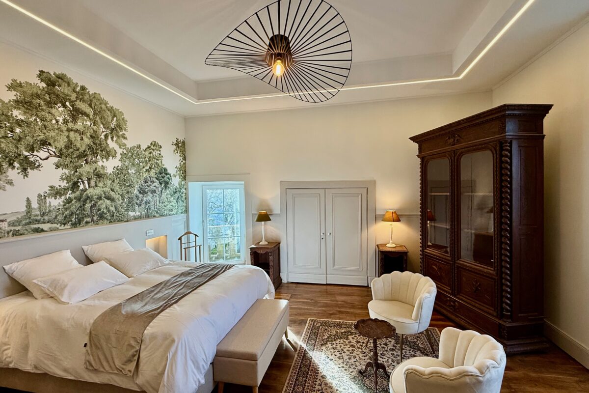 Cette chambre de 45m2, nommée en référence à Martel, « la ville aux sept tours », citée médiévale du Quercy située à 12 minutes du château en voiture, a été entièrement rénovée dans l’esprit d’une alliance entre histoire et modernité.